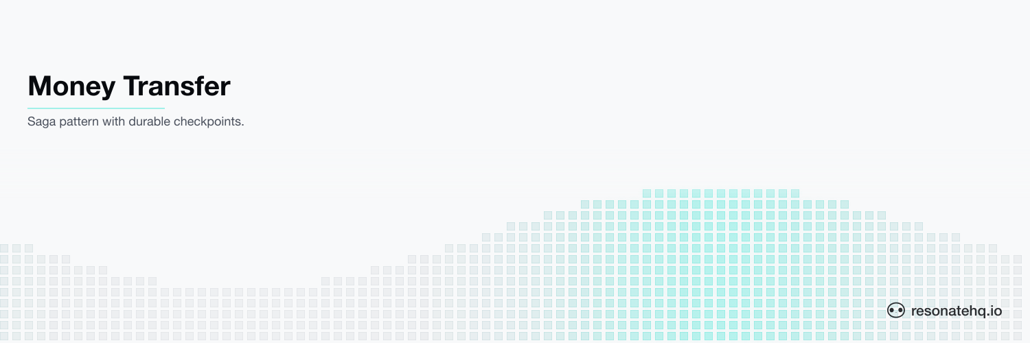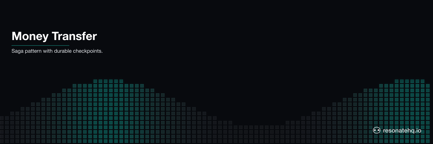 Each account update is a checkpoint. If the worker dies after the debit but before the credit, restart resumes at the credit — the debit is not re-issued. The transfer ID is the workflow ID; calling the endpoint a second time with the same ID returns the cached result rather than running the workflow again. The "saga" is just two ctx.run calls in sequence, with the durability story handled by Resonate.