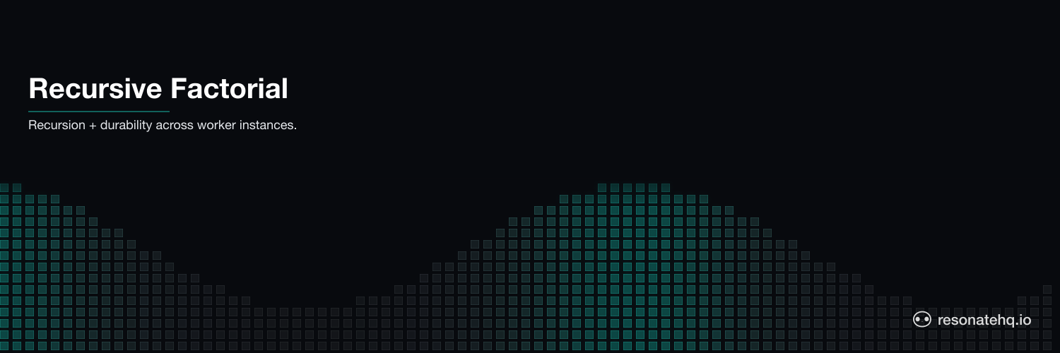 resonate devnpx tsx factorialWorker.tsnpx tsx factorialClient.ts 10Watch the three worker terminals — factorial(10), factorial(9), factorial(8) … fan out across the workers as recursion descends.