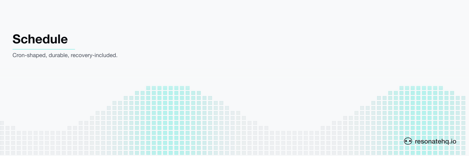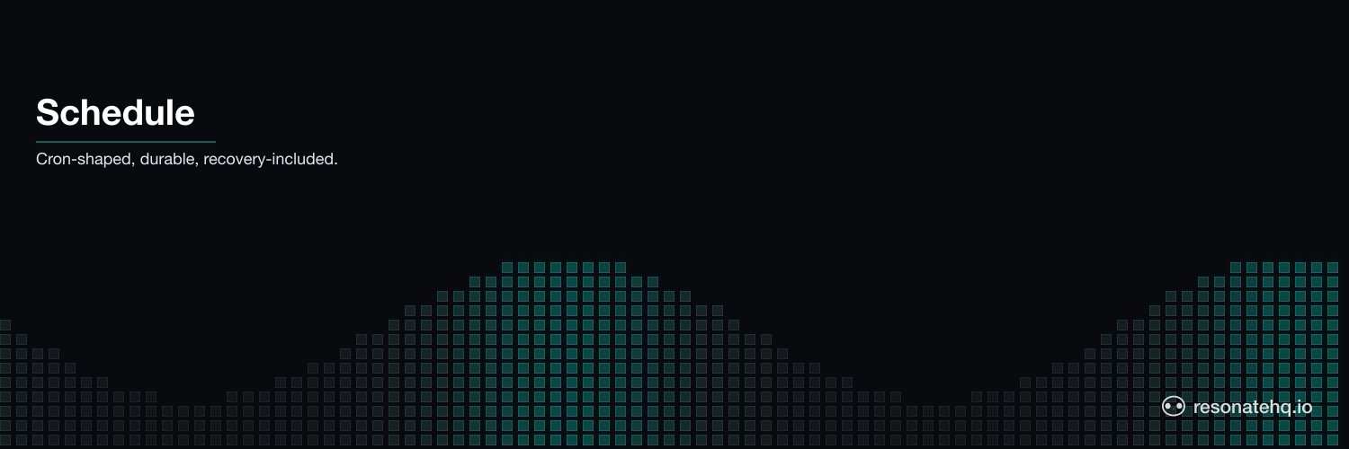 Register a function to run on a cron expression and Resonate handles the rest. Every fired execution is a durable workflow — a worker that crashes mid-run hands off to a survivor, and a missed run because all workers were down still gets dispatched when one comes back.